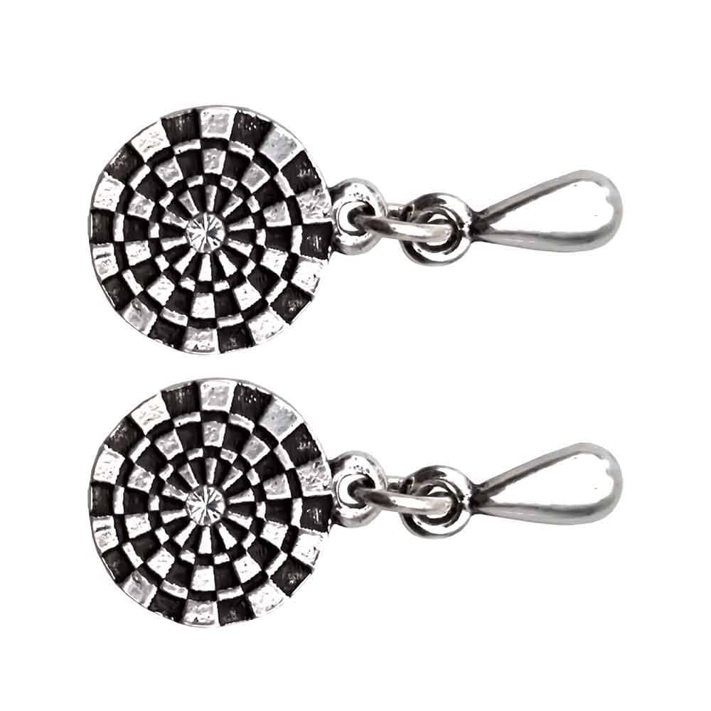 Pendiente con diseño diana acabado colot plata vieja. Diseño original de pendientes con motivo de dardos, sin duda si quieres sorprender a tus amigos y compañeros del club con estos pendiente lo conseguirás ya que su diseño es muy original. Producto: Pendientes Color: Plata Vieja Diseño: Diana Materiales: Peltre,laton,plata Oxidada y cristal El producto se compone por 1 par de 2 pendientes