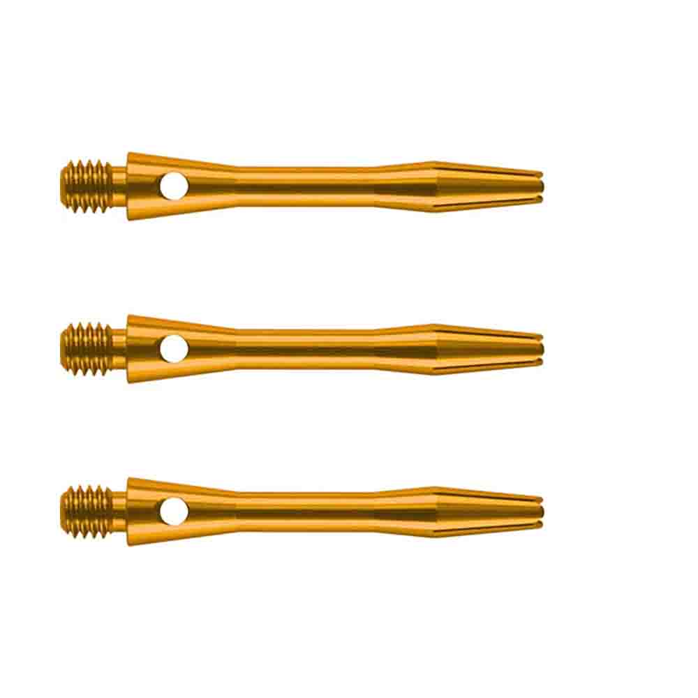 Cañas para dardos de gran calidad, fabricadas en aluminio en Reino Unido, cañas para dardos con una medida de 28mm sin contar la rosca y acabadas en color dorado Medida: 41mm Color: Dorado Cañas por bolsa: 3 Material: Aluminio Translucida: No El producto se compone por 1 set de 3 cañas de aluminio para dardos de medida 41mm sin contar la rosca