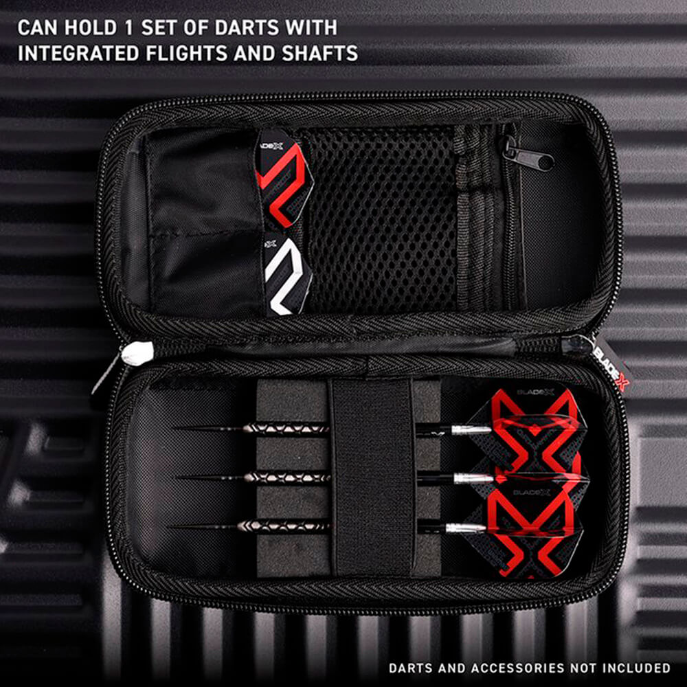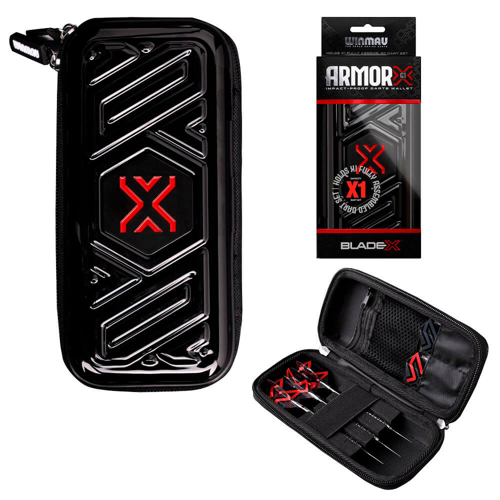 Una funda negra a prueba de impactos diseñada para cumplir con los estándares de un profesional de dardos. Con su diseño premium Blade X y su resistente carcasa blindada, esta billetera combina una estética moderna con funcionalidad protectora. Dardera Color: Negra Rojo Medidas: 18 x 9 x 5.5cm Funda de dardos con capacidad para un juegos de dardos montados y gran cantidad de repuestos ya que dispone de compartimentos multiusos. Blade X Armour G1