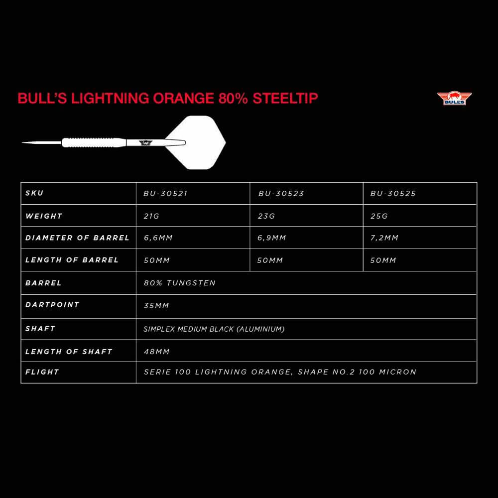Dartstore Dardos Bulls Darts Lightning Orange P.Metal 80% 25g BE-30525