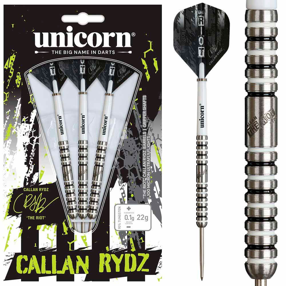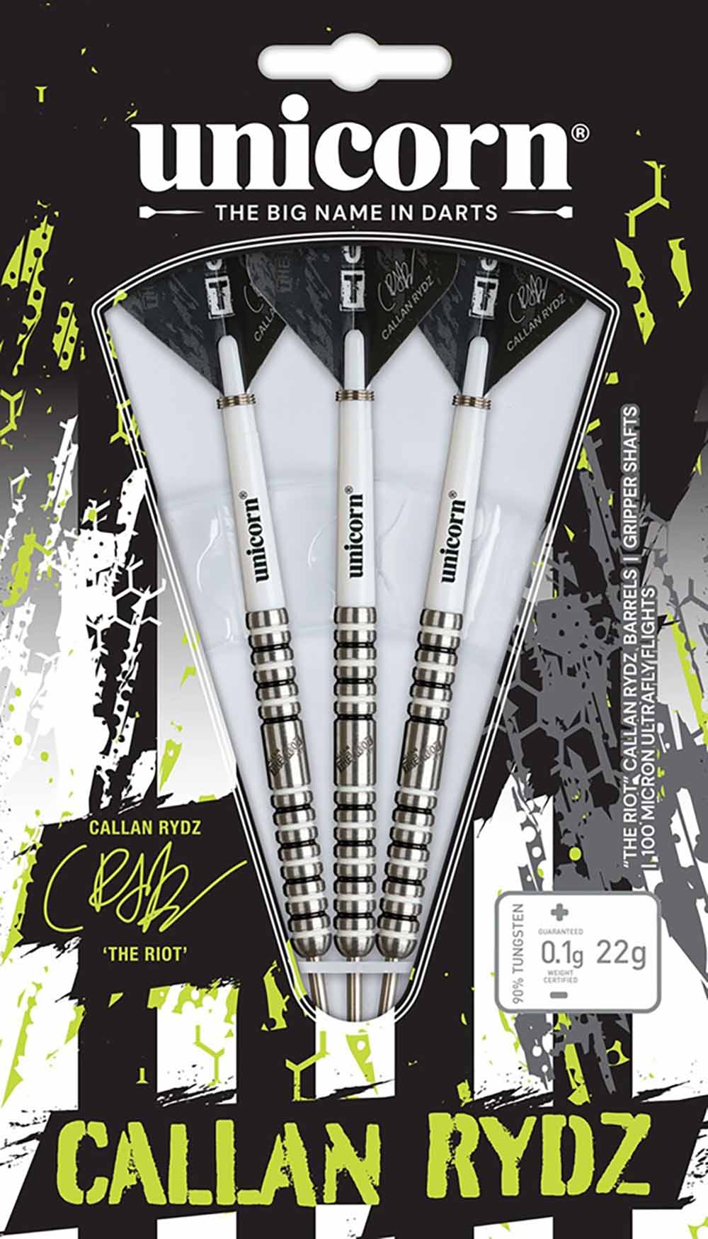 Juego de dardos fabrica por Unicorn Darts y diseñado por Callan Rydz, apodado The Riot , es uno de los jugadores jóvenes más prometedores y talentosos del circuito. Con estos mismos dardos, en 2025 Callan alcanzó los cuartos de final del Campeonato Mundial por segunda vez en su carrera, finalizando segundo en la clasificación general del torneo con una impresionante puntuación de 100,88. Los dardos Callan Rydz Phase 2 tienen barriles de tungsteno al 90%, con el icónico logo The Riot y rayas blancas y negras como su bandera de su ciudad natal, Newcastle. Los barriles se complementan con las cañas Gripper 4 White, la nueva pluma Ultrafly de Callan y las puntas Volute patentadas de Unicorn, que proporcionan un agarre increíble en la diana sin dañarla. Marca: Unicorn Gama: Phase 2 Modelo: Callan Rydz Phase Material: 90% Tungsteno Peso barril: 20gr Peso total: 18.5gr aprox Longitud barril: 48.00mm Diámetro barril: 6.3mm Tipo de punta: Metal – Steel Tip Rosca de la caña: 2ba 4mm El juego de dardos Unicorn Callan Rydz Phase 2 se compone por 1 set de 3 cuerpos con punta de metal, 1 set de 3 cañas Unicorn y 1 set de 3 plumas