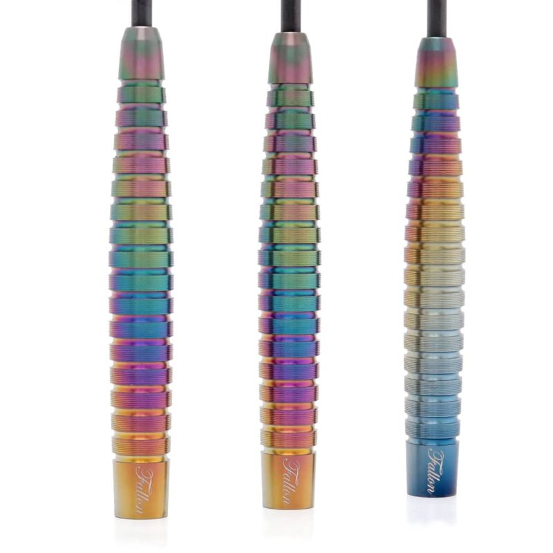 Dardos de gran calidad fabricados en Japón por Dynasty Darts y diseñados por Fallon Sherrock (Queen of Palace). El contorno de Fallon 3, que es abrumadoramente popular, se mantiene tal cual, y se agrega un microcorte súper delicado. Arreglo de corte sofisticado con una hermosa forma aerodinámica Completado en tonos brillantes color arcoíris. Marca: Dynasty Modelo: Fallon 3 MG Diseño: Fallon Sherrock Material: 90% Tungsteno Diámetro: 7.2mm Largo Barril: 52.5mm Tipo de punta: Metal – Steel Tip Peso del barril: 23 gr Peso total: 24.5 gr aprox El juego de dardos se compone por 1 set de 3 cuerpos de dardos Dynasty A-Flow Fallon 3 con puntas de acero, 1 set de 3 cañas y 1 set de 3 plumas.