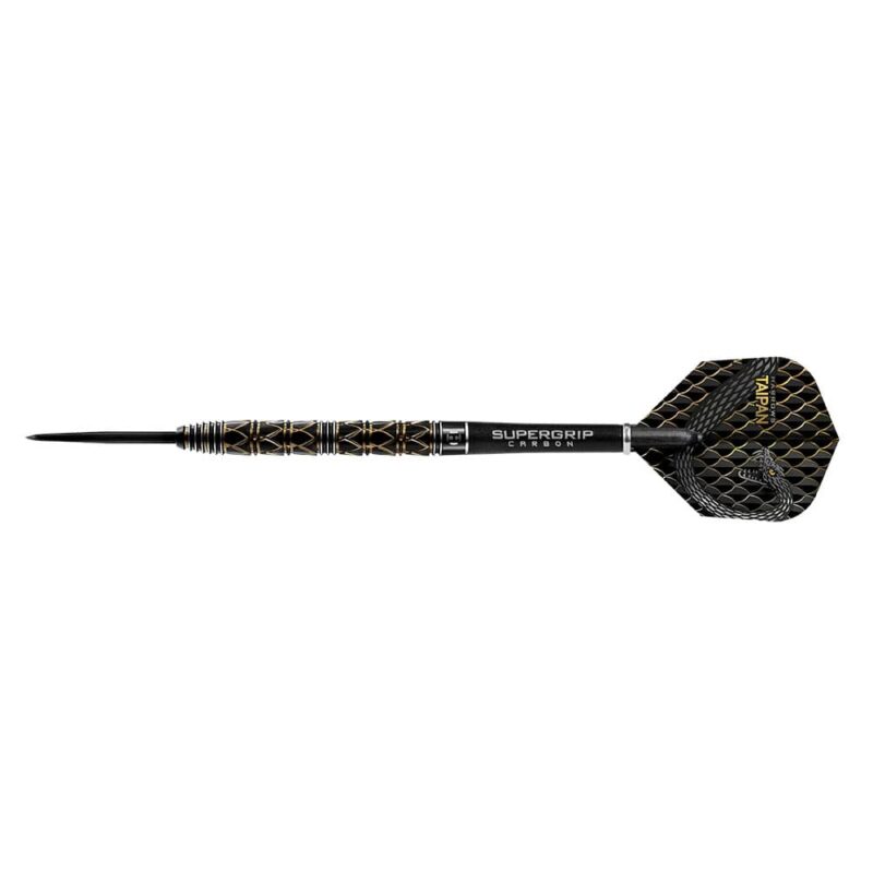 Los dardos Taipan esta fabricados por la prestigiosa marca Inglesa de dardos Harrows Darts, dardos con un 90% de tungsteno y un diseño muy elegante. Dardos fabricados por los expertos diseñadores de Harrows Darts usando sus nuevas maquinas de CNC que han fusionado las técnicas mas vanguardistas en dardos para hacer un dardos elegante y muy preciso que ofrecerá al jugador sensaciones únicas que solo el nuevo Taipan puedes ofrecer. Dardos fabricado por moldeado de inyección con un 90% de tungsteno, fresado de incisión bilateral combinado con cortes muy precisos que aporta un taco perfecto, cuerpos fabricado con un equilibro perfecto y acabado con nitruro de titanio negro muy resistente y revestimiento dorado metalizado. Marca: Harrows Darts Modelo: Taipan Peso: 26 gramos con precisión del 0.05g Material: 90% de tungsteno Medida del cuerpo: 7.2mm x 50mm El dardos se compone por 1 set de 3 cuerpos Harrows Taipan, 1 set de 3 cañas Harrows Carbon y 1 set de 3 plumas Taipan Original