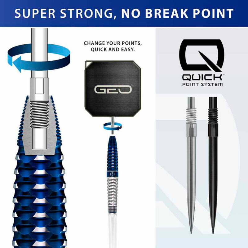 Presentamos Geo, el pináculo de la ingeniería de Harrows y el comienzo de una nueva era en el diseño de dardos de Harrows. Tras una exhaustiva investigación y desarrollo, nuestros equipos de diseño y fabricación han creado Geo para ofrecer un control, una confianza y una precisión inigualables en el oche. Con cortes meticulosamente fresados ??a lo largo del cañón, cada contorno es fruto de rigurosas pruebas y avanzados procesos de fabricación para ofrecer a los jugadores el mejor agarre y sensación en la mano. Los dardos Geo garantiza un dardo perfectamente equilibrado para cada jugador y cada estilo de lanzamiento. La innovación va más allá del cañón. Cada juego de dardos Geo incorpora la tecnología Quick Point, que permite a los jugadores personalizar la longitud de la punta en segundos y adaptar su configuración para una máxima confianza en el oche. Los dardos Geo también se combinan con nuestras nuevas plumas integradas Midi Solo, con tecnología Aero Core: una microtextura en la zona central de la pluma reduce la turbulencia y mejora la estabilidad, mientras que las suaves alas exteriores minimizan la resistencia para mantener la velocidad y una precisión milimétrica. Visualmente, Geo es una impactante declaración de rendimiento. Los cañones cuentan con un duradero revestimiento de nitruro de titanio azul bicolor combinado con tungsteno natural, lo que da como resultado una estética premium y llamativa que refleja la tecnología que lo caracteriza. Presentado en una caja de presentación rígida de EVA Geo, cada juego incluye un juego de repuesto de Quick Points, una herramienta Quick Point premium con almacenamiento de puntos integrado, nuestro nuevo estuche de transporte rígido Vault premium y vuelos Midi Solo transparentes. Cada dardo está pesado con una tolerancia exacta de +/- 0,05 g, lo que garantiza una consistencia y confiabilidad absolutas en cada lanzamiento. Marca: Harrows Modelo: Geo Diseño: Torpedo Longitud: 50mm Diametro: 7.35mm Peso total: 23g Peso cuerpo aprox: 21.5g Material: 90% Tungsteno Rosca Caña: 2ba Precision peso: +/- 0.05G El juego de dardos se compone por 1 set de 3 cuerpos Harrows Darts Geo , 1 set de 3 cañas Supergrip , 1 set de 3 plumas Impact, 2 juego de puntas Quick y 1 herramienta de punta rápida incluida con dardos con punta de acero