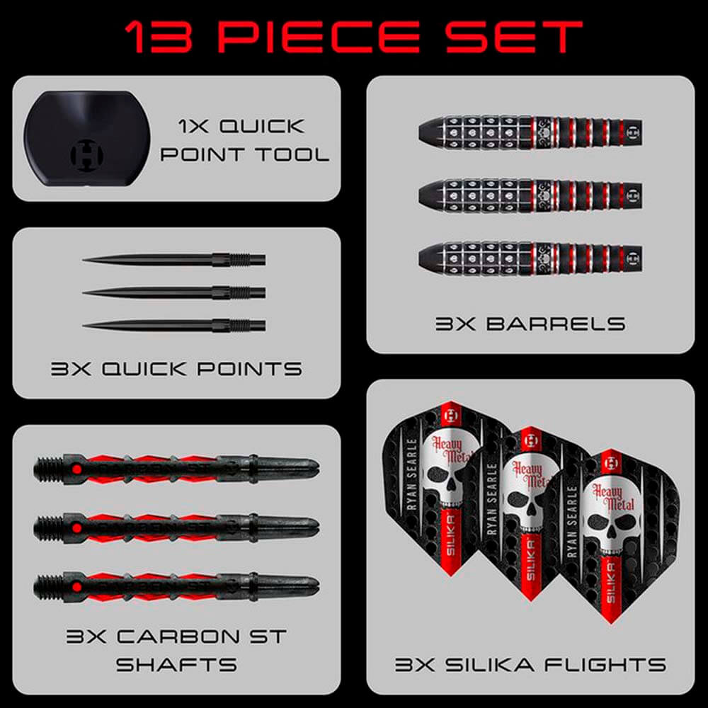 Dardos diseñado en estrecha colaboración con Ryan Heavy Metal Searle, el jugador sinónimo de los dardos más pesados en el circuito profesional, la Serie 3 ha sido elaborada meticulosamente para brindar la máxima confianza y precisión bajo presión, al tiempo que captura la personalidad audaz de uno de los jugadores más reconocibles del juego. Después de un extenso trabajo con nuestro equipo de diseño, los nuevos dardos de Ryan cuentan con una sección frontal completamente fresada con forma de calavera, una estética que encarna a la perfección la identidad de Heavy Metal al tiempo que ofrece un punto de referencia único en el cuerpo del dardo para mejorar la consistencia del agarre. Manteniendo el perfil cónico preferido del jugador Ryan, los cañones están recubiertos con un resistente acabado de nitruro de titanio negro, seguido de un proceso de arenado grueso para crear una sensación de gran seguridad en la mano. Los llamativos anillos rojos en la parte trasera conservan los colores característicos de Ryan y añaden un toque visual al oche. La Serie 3 también cuenta con la tecnología Harrows Quick Point, que permite a los jugadores ajustar la longitud y el estilo de la punta en segundos, lo que le permite adaptar su configuración con precisión a las condiciones y al estilo de lanzamiento. Fabricados con 90% de tungsteno de primera calidad y pesados con una tolerancia precisa de +/- 0,05 g para una consistencia impecable. Cada juego viene completo con Quick Points de 26 mm (juegos de puntas de acero), varillas Midi Red Carbon ST y los nuevos vuelos Heavy Metal 100 Micron Silika, lo que brinda una configuración premium lista para jugar que le permite jugar con la misma precisión de golpeo pesado que Ryan. Longitud: 51mm Diámetro: 7.15mm Peso total: 26g Peso cuerpo aprox: 24.5g Material: 90% Tungsteno Rosca Caña: 2ba Precision peso: +/- 0.05G El juego de dardos se compone por 1 set de 3 cuerpos Harrows Darts Ryan Searle V3, 1 set de 3 cañas Supergrip , 1 set de 3 plumas Impact, 1 juego de puntas Quick y 1 herramienta de punta rápida incluida con dardos con punta de acero