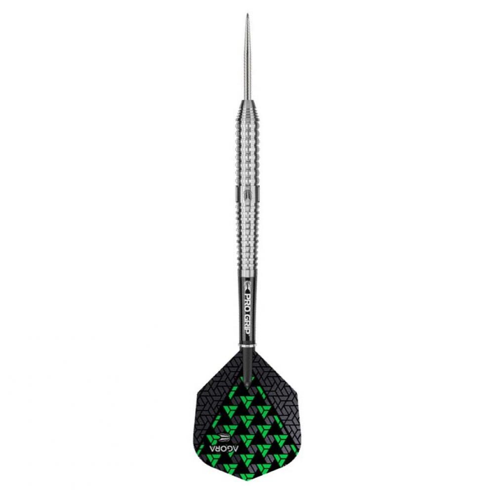 Target Darts Agora A04 23g Steel Tip Darts Peso Total 23 Gramos 90% Tungsteno El pack se compone por 3 cuerpos dardos Agora A04 23g, set de 3 plumas Target, set de 3 cañas nylon Pro Grip. Largo dardos 52.00mm Diámetro 6.8mm