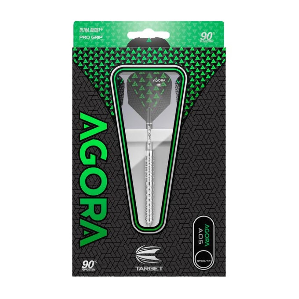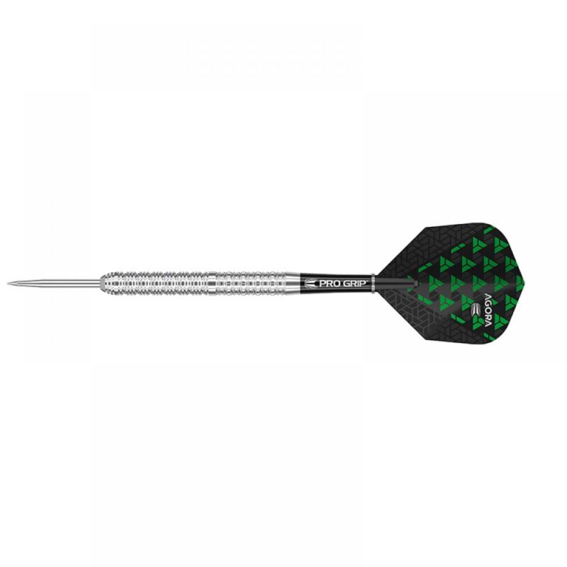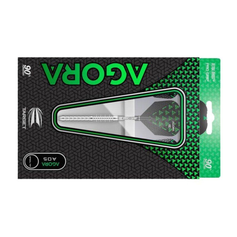 Juego de dardos de la marca Target Darts Agora A05 con peso de 22 gramos, dardos con una característica de gran valor ya que su barril tiene dos tipos de agarre que aporta una increíble precisión gracias a su excelente agarre. Steel Tip Darts Peso Total 22 Gramos 90% Tungsteno Largo dardos 49.50mm Diámetro 7.15mm El pack se compone por 3 cuerpos dardos Agora A05 22g, set de 3 plumas Target, set de 3 cañas nylon Pro Grip.