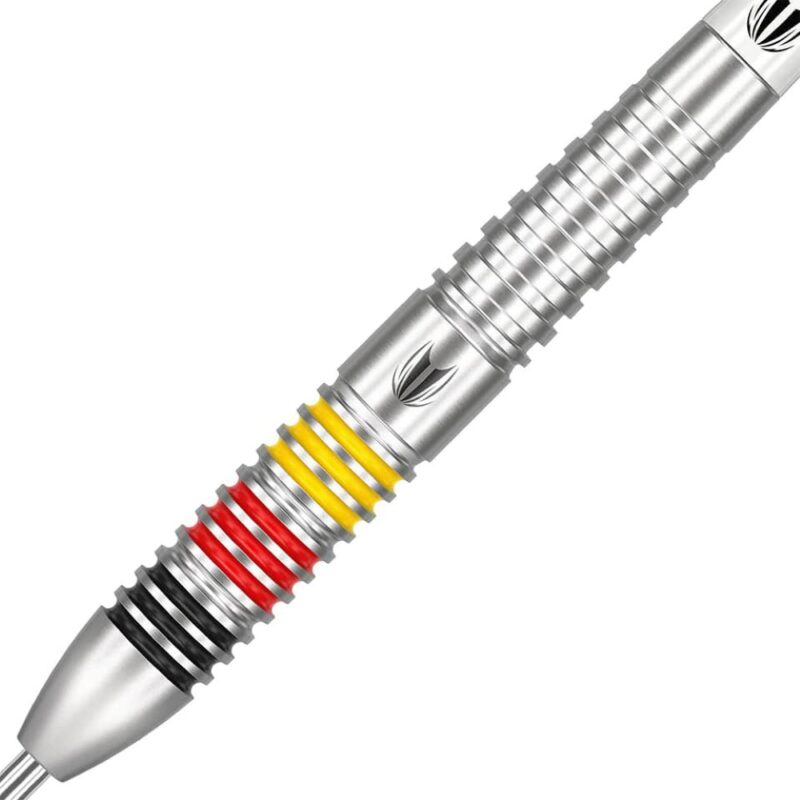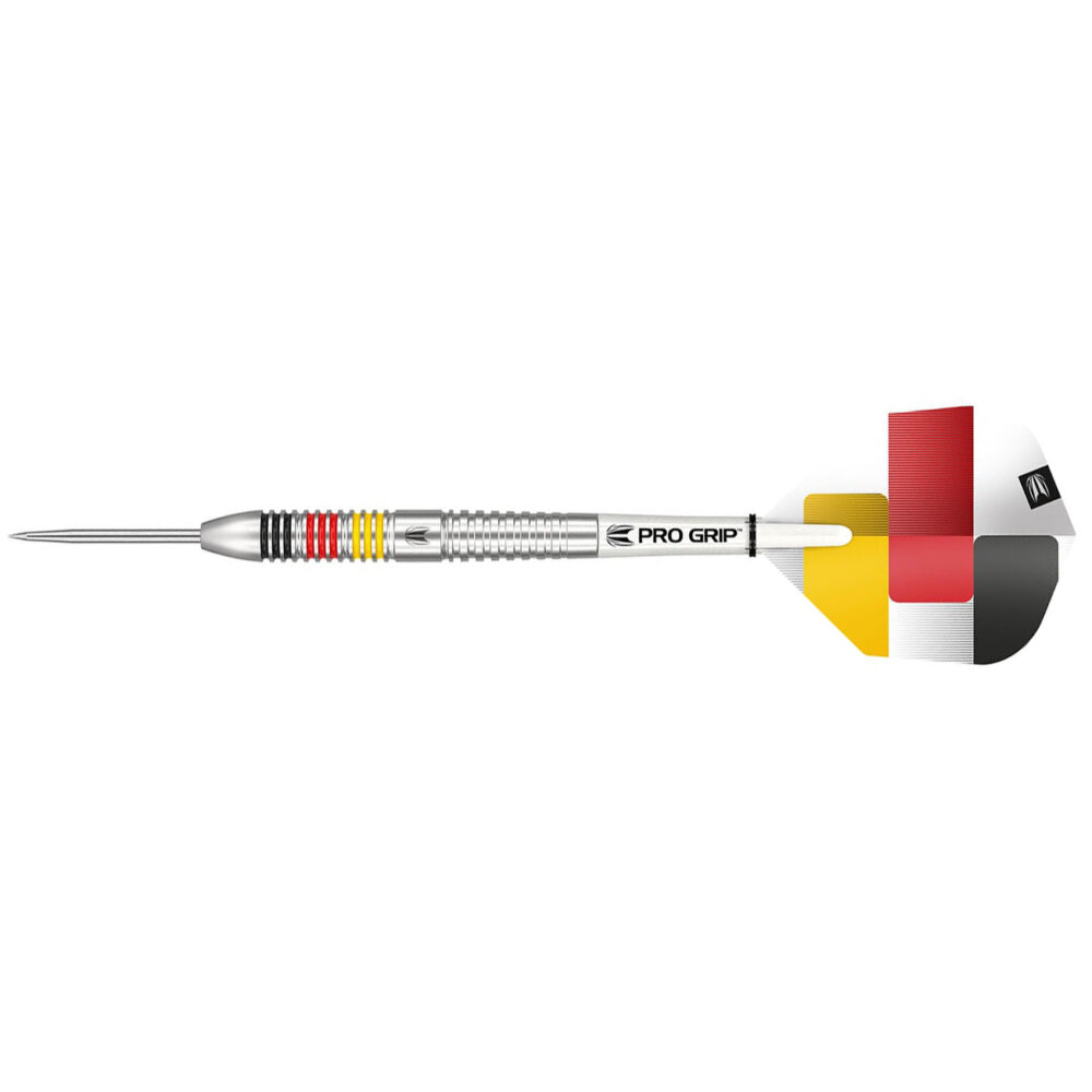 Dardos fabricados por la prestigiosa marca de dardos Target y diseñados por el jugador Gabriel Clements mas conocido en el mundo de los dardos como German Giant. El jugador Gabriel Clement junto a Target Darts nos han sorprendido con un dardos con diseño impecable, con un cuerpo recto con ranuras radiales y muy detalladas, con el acabado del color de bandera de Alemania. Marca: Target Modelo: German Giant Gabriel Clements Peso: 22 gramos Tipo punta: Steel Tip Material barril: 80% tungsteno Largo barril: 52.0mm Diámetro barril: 6.8mm El productos se compone por 1 set de 3 cuerpos German Giant Gabriel Clements 21g ,3 x Dart Barrels,3 x Pro Grip Shafts,3 x Gabriel Clements Flights y 3 Steel Til