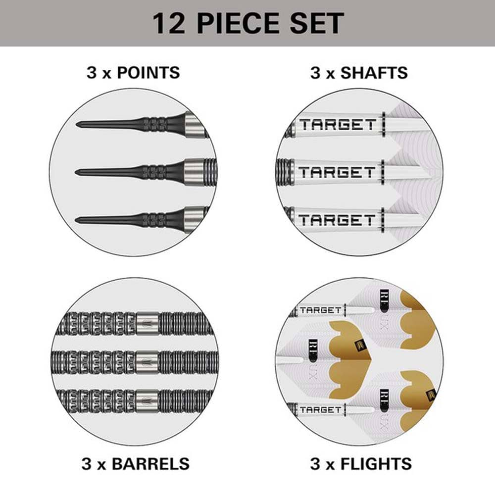 La gama de dardos Redux se inspira en los intrincados detalles de nuestros agarres de barril con corte pixelado: una sorprendente combinación de forma y función. Cada barril, compuesto por un 90 % de tungsteno, está adornado con finos cortes en forma de diamante, lo que proporciona un control y un equilibrio excepcionales en cada lanzamiento. Las sutiles ranuras radiales en la parte delantera y trasera permiten una colocación sencilla de los dedos, dándote la libertad de adaptar el agarre a tu estilo. Cada juego de puntas de plástico incluye puntas Pixel negras, diseñadas para un rendimiento excepcional con mínimo rebote. Fabricadas con materiales de primera calidad, ofrecen una durabilidad excepcional y un agarre mejorado para los dedos, brindándote confianza y control en cada lanzamiento. Las cañas Pro Grip TAG están fabricadas con un compuesto de nailon resistente para un agarre máximo y una estabilidad de vuelo óptima. En combinación con las plumas Pro Ultra No6, esta configuración no solo ofrece un rendimiento excepcional, sino que también refleja la elegante estética de la gama Redux. Cada paquete Redux incluye un mes de acceso gratuito a la app DartCounter, la plataforma líder mundial de puntuación de dardos. Juega contra tus amigos, compite en línea con jugadores de todo el mundo y registra tus estadísticas a medida que progresas. Marca: Target Modelo: Redux 10 Longitud: 50.0mm Diámetro: 6.2mm Peso del barril: 16.5gr Peso total: 18gr Material: 90% Tungsteno Tipo de punta: Plástico con rosca 2ba 4mm Target Pixel Tip El juego se compone por 1 set de 3 cuerpos de dardos Target Redux 1 set de 3 puntas de plástico Target Pixel Tip 1 set de 3 cañas Pro Grip 1 set de 3 plumas Pro Ultra No6 1 suscripción mensual a la aplicación DartCounter