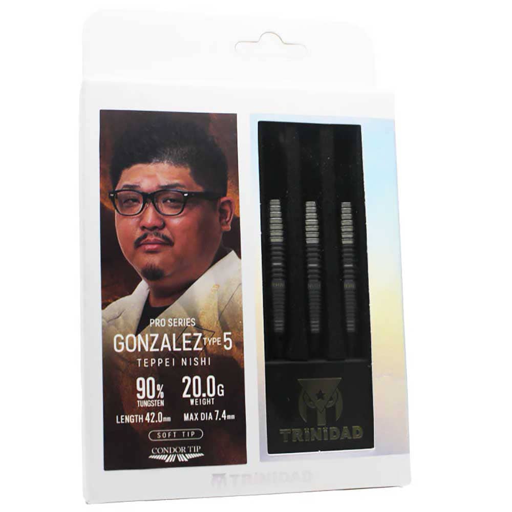 Dardos de excelente calidad fabricados por la marca de dardos Trinidad y diseñados por Teppei Nishi mas conocido en el mundo de los dardos por Gonzalez ahora en la versión 5. Marca: Trinidad Modelo: Gonzalez Type 5 Peso: 20g Material Barril: 90% Tungsteno Longitud: 42.00mm Diámetro: 7.4mm Modalidad juego: Punta Metal El producto se compone por 1 set de 3 barriles Gonzalez 5, 1 set de 3 cañas Trinidad y 1 set de 3 plumas Trinidad.