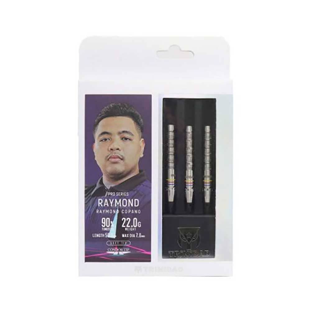Dardos fabricados por Trinidad Darts y diseñados por el jugador de Trinidad Condor Raymond Copano mas conocido como Raymond. Marca: Trinidad Modelo: Raymond Diseño: Raymond Copano Peso: 22g Material: 90% Tungsteno Longitud barril: 50.0mm Diámetro barril: 7.0mm Tipo de punta: Plastico Soft Tip El juego de dardos se compone por 1 set de 3 cuerpos Raymond Copano , 1 set de 3 plumas Trinidad y 1 set de 3 cañas Trinidad.