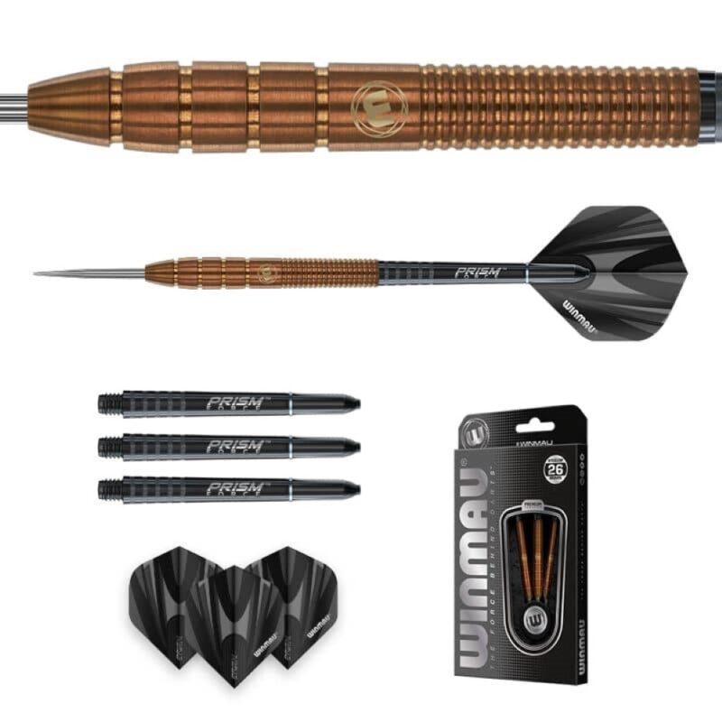 La estrella de Nueva Zelanda y ganador de la Copa del Mundo de singles Darren Herewini ha diseñado su último barril para adaptarse a su lanzamiento técnicamente perfecto y moderno. El hipnotizante maorí ha capturado a muchos fanáticos con su estilo emocionante y extravagante, que se refleja perfectamente en sus dardos. Darren ha optado por un estilo de ponderación frontal de doble agarre que, en su opinión, le ayuda a conseguir la trayectoria más suave hacia la diana. Los dardos se sienten largos en la mano con un agarre más fuerte en la parte trasera y un control suave en la parte delantera. Acabados con una capa de bronce bruñido, estos son el epítome del diseño moderno de dardos. Marca: Winmau Modelo: Darren Herewini Material: 90% Tungsteno Peso barril: 26gr Peso total: 27.5gr aprox Longitud barril: 50.8mm Diámetro barril: 7.16mm Tipo de punta: Metal Rosca de la caña: 2ba 4mm El juego de dardos Winmau Darren Herewini 26gr se compone por 1 set de 3 cuerpos con punta de metal, 1 set de 3 cañas Prism Force Short, 1 set de 3 plumas Prism Alpha y 1 protector de puntas de metal.