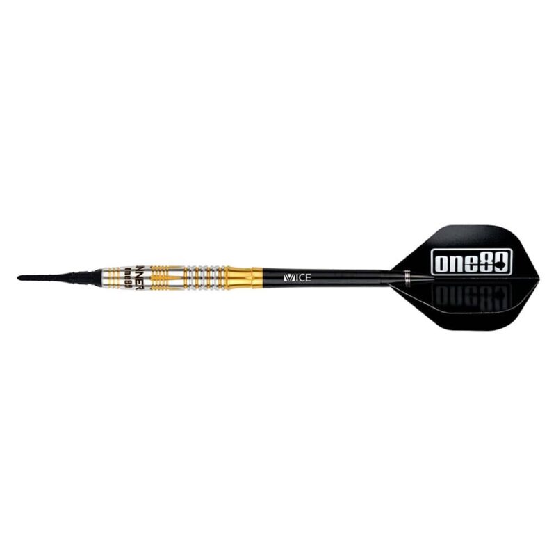 El juego de dardos Gunner Omega I, diseñados por el jugador One80 Lourence Ilagan, con su característico color dorado y plata. Su diseño combina cortes de anillo con algunas líneas verticales para un mejor agarre, lo que le da al dardo un toque único y original. Marca: One80 Modelo: Gunner Omega I Diseño: Lourence Ilagan Longitud del barril: 45mm Diámetro del barril: 7mm Peso barril: 18gr Peso total aprox: 19.5gr Material: 90% Tungsteno Tipo de punta: Plástico rosca 2ba 4mm Rosca Caña: 2ba 4mm El juego de dardos One80 Gunner Omega I Lourence Ilagan se compone por 1 set de 3 cuerpos, 1 set de 3 cañas Vice, 1 set de 3 plumas y 3 puntas de plástico rosca 2ba 4mm.