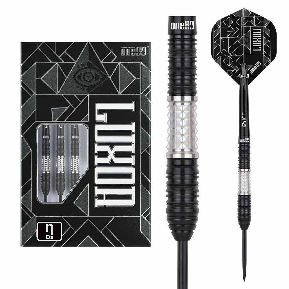 Dardos fabricados por One 80 modelo Luxor Eta ahora en su versio II, dardos de gran calidad con un acabado increible gracias a su acabado en negro y plata todo ello con un tacto excelente. Marca: One 80 Modelo: Eta Version: II Largo Barril: max 48.0mm Diámetro Barril: max 7.2mm Peso del cuerpo: 22 gramos Material Barril: 90% Tungsteno El juego de dardos Luxor Eta II se compone por 1 set de 3 cuerpos, 1 set de 3 cañas y 1 set de 3 plumas