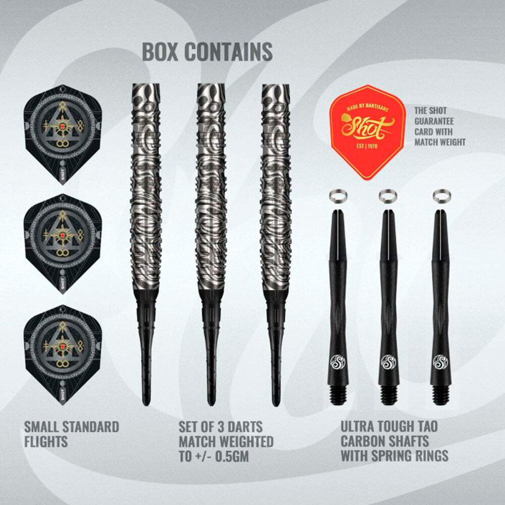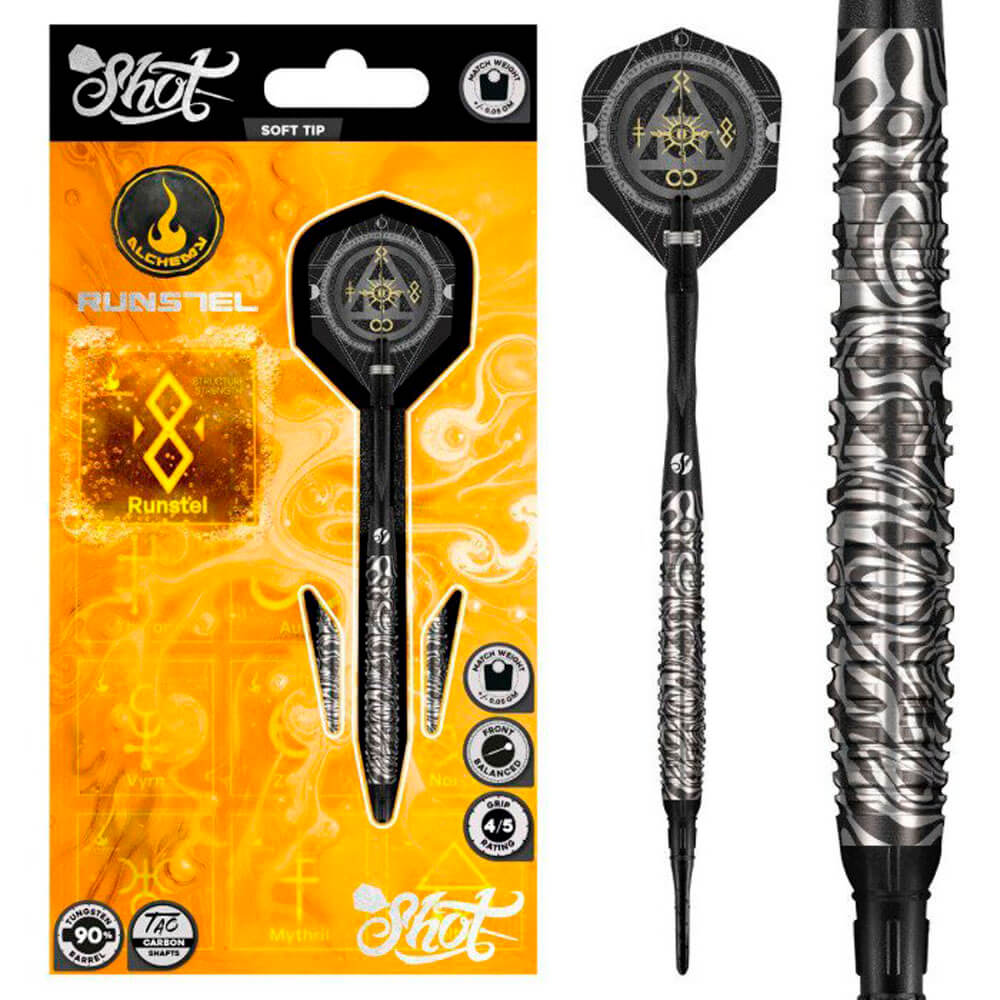 Los dardos Shot Softtip Alchemy Runstel 90% de 20 g combinan una fabricación precisa con materiales duraderos y están diseñados para un rendimiento constante en dianas electrónicas. Fabricados con un 90% de tungsteno, estos dardos ofrecen una durabilidad profesional, mientras que su perfil compacto garantiza agrupaciones precisas y una sensación estable en la mano. Marca: Shot Darts Modelo: Alchemy Runstil Peso total: 20gr Largo Barril: 45mm Diámetro Barril: 7mm Tipo de punta: Plástico rosca 2ba 4mm Rosca cañas: 2ba Material: 90% Tungsteno El dardos se compone por 1 ser de 3 cuerpos Shot Alchemy Runstil 20gr 90%, 1 ser de 3 cañas, 1 set de 3 plumas y 1 set de 3 puntas 2ba