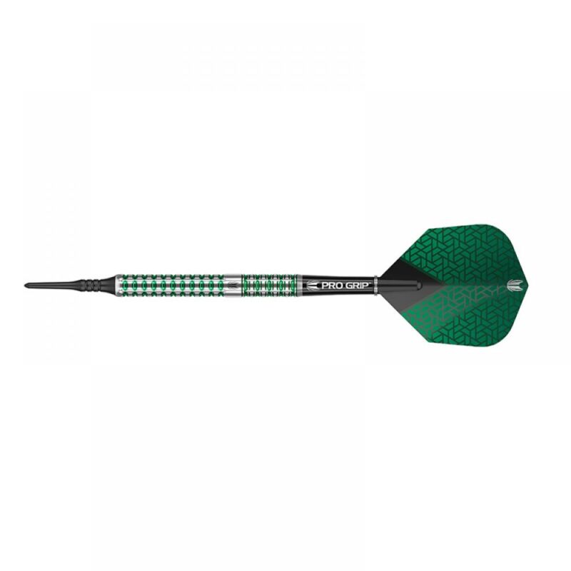Juego de dardos fabricado Target Darts Agora Verde modelo AV31 18gr, dardos con un 90% de tungsteno. Soft Tip Darts Peso 18 Gramos punta 2ba pixel Largo dardos 50mm Diámetro dardo 6.4mm El pack se compone por 3 cuerpos dardos Agora Verde AV31 Target Darts, set de 3 plumas Target, set de 3 cañas Pro Grip y 1 set de 3 puntas 2ba 4mm