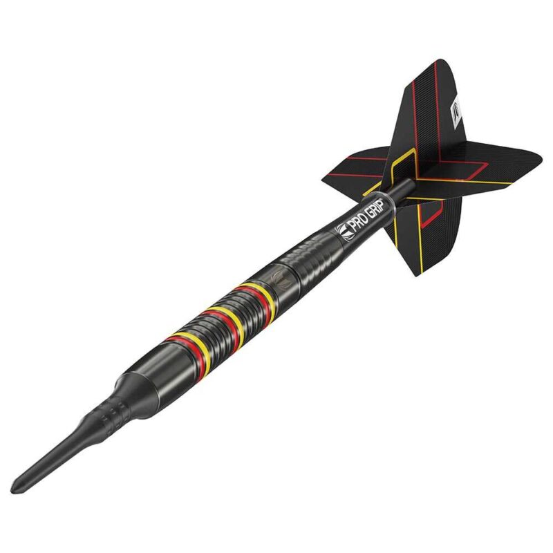 Dardos Target de última generación, fabricados en Reino Unido por Target Darts, dardos con un 80% de tungsteno. La gama de dardos Gabriel Clemens Black, muestra un dardo con la personalidad del gran jugador alemán, gracias a su acabado en color negro con líneas rojas y amarillas en representación de la bandera alemana. Contiene 2 zonas de agarre separadas por una zona lisa central con el logo de Target, en la parte delantera tiene un anillado clásico con las líneas rojas y amarillas de su bandera y en la trasera muestra cortes shark de aleta de tiburón que permiten lanzar el dardo con más impulso. Marca: Target Modelo: Gabriel Clemens Black Longitud: 53.3mm Diámetro: 6.6mm Peso del barril: 19.5 Gr Peso total: 21 Gr aprox Material: 80% Tungsteno Tipo de punta: Plástico rosca 2ba 4mm El juego se compone por 1 set de 3 cuerpos de dardos con punta Swiss Point Gabriel Clemens Black 21gr, 1 set de 3 cañas pro grip negro short, 1 set de 3 plumas Pro Ultra, 3 puntas Target Pixel Tip negra y 1 funda pequeña de cuero negra.