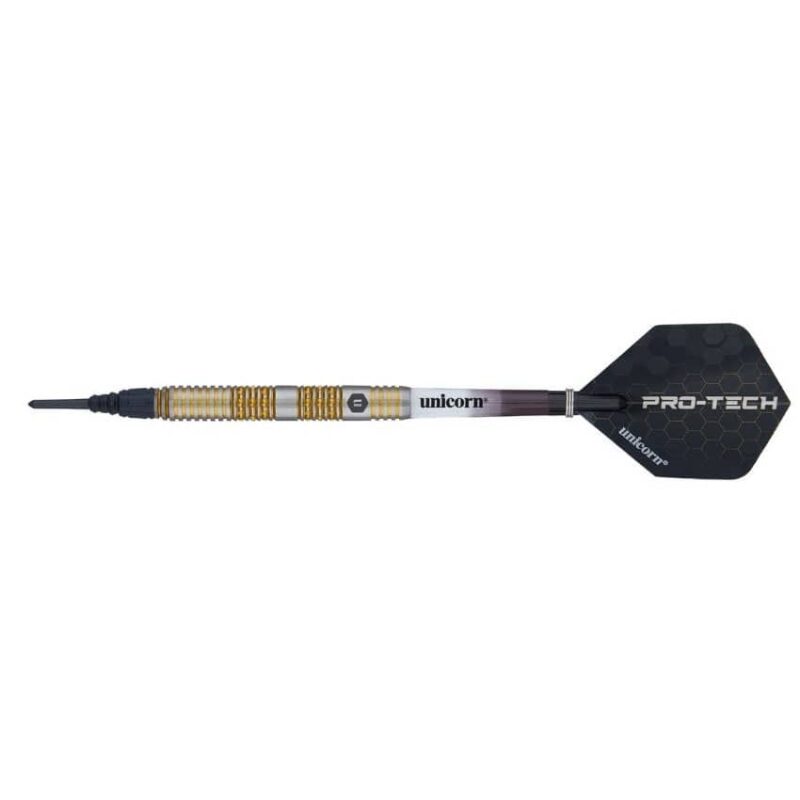 La gama Unicorn Pro-Tech combina el agarre preferido y la forma del cañón necesarios para ganar al más alto nivel en los dardos con lo último en tecnología de vanguardia para impulsar los dardos a nuevas alturas. Pro-Tech se deriva de algunos de los mejores cañones utilizados por los jugadores Unicorn, pero se reinventó gracias a la adición de un mecanizado complejo y un revestimiento impresionante. Juntos, nuestro impulso por la excelencia en ingeniería sustenta equipos de alto rendimiento creados junto y para los mejores jugadores del mundo. La gama Pro-Tech se completa con varillas Unicorn Gripper, impresionantes plumas Unicorn Ultrafly y puntas Epic Soft. Marca: Unicorn Darts. Modelo: Pro-Tech Gama: Style 6 Peso total: 18gr Longitud barril: 48mm Diámetro barril:. 6.6mm Punta: Plástico rosca 2ba 4mm Material: 70% Tungsteno El producto se compone por 1 set de 3 cuerpos de dardos Pro-Tech ,1 set de 3 plumas, 1 set de 3 cañas y 3 puntas de plástico.