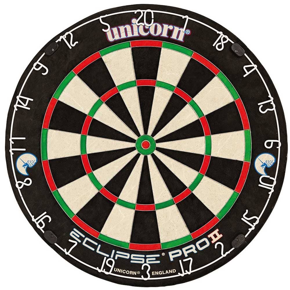 Nueva generacion de la diana Eclipse Pro ahora en su version dos, fabricada con sisal de mejor calidad, numeros mas visibles y mejor acabados. Nuevo Bulls con un 14% de area de juego Nueva separacion de segmentos ultra fina y de mejor calidad Diana fabrica por Unicorn Darts Diana de calidad profesional