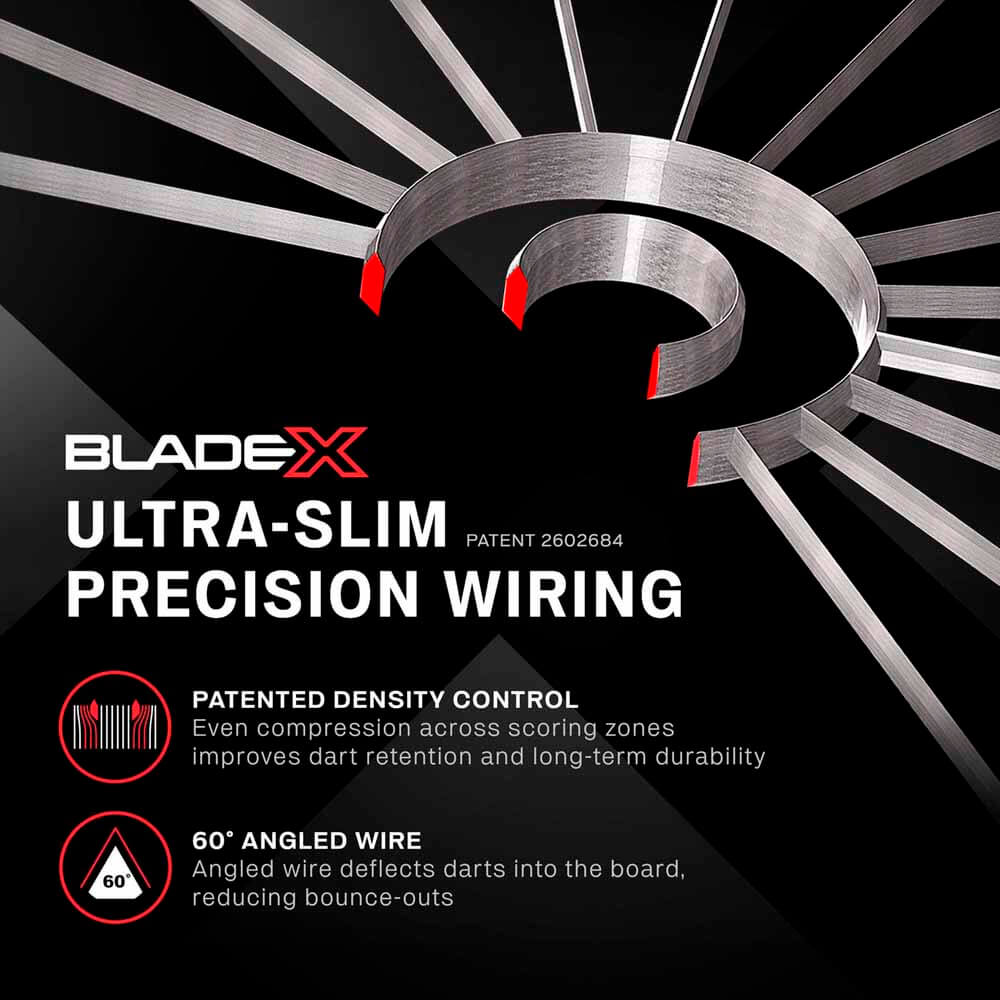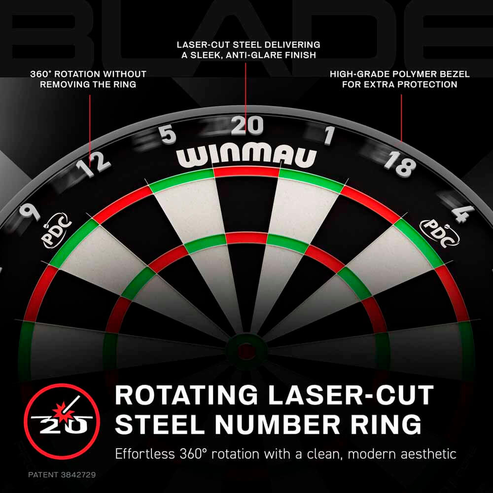 La mejor diana de Winmau, la diana Blade X para jugar a los dardos a nivel profesional. El Blade X es el tablero de dardos más avanzado del mundo y el nuevo tablero oficial de la PDC que subirá tu juego a otro nivel. Desarrollado para un rendimiento de nivel profesional, ofrece una consistencia de puntuación sin igual, menos rebotes y una durabilidad excepcional gracias a su calidad de sus materiales gracias a la experiencia obtenida por Winmau por toda su gama de diana Blade. Diseñado para una máxima consistencia en la puntuación con Tecnología de ultima generacion Pro Core. Tienes a tu mano la diana de dardos más avanzada del mundo, con la mejor densidad de sisal con capas para reducir la resistencia superficial y mejorar la penetración del dardo evitando rebote. Esta profundidad de sisal es un 13% mayor que otros modelos y está unida a una placa trasera premium de madera dura laminada. Tecnología patentada Density Control Wire de Winmau. Han optimizado la densidad del sisal en zonas de puntuación críticas aumenta la durabilidad y garantiza una retención superior del dardo justo donde más importa. Un sistema de cableado ultra delgado inclinado que amplía la superficie de las zonas de puntuación, con un diseño de hilo inclinado a 60 grados que guía los dardos hacia las áreas clave de puntuación y reduce drásticamente los rebotes y rechazos. La capa de sisal más profunda del mundo maximiza la absorción del impacto, reduce los rebotes y aumenta el potencial de puntuación gracias a una penetración más profunda del dardo y una mayor estabilidad del tablero. El Blade X ofrece un rendimiento autorreparable excepcional, mantiene una superficie de juego impecable y prolonga significativamente la vida útil del tablero. Diseñado para soportar la competición de alto nivel, el Blade X es probado exhaustivamente por los mejores profesionales del mundo. Fabricado con sisal africano de la más alta calidad premium, seleccionado por su resistencia y pureza, que ofrece una densidad de fibras sin igual de más de 5,5 millones de fibras por tablero, resultando en la superficie de juego más consistente y sensible jamás producida. Fabricado a mano por los ingenieros de Winmau que mejora la precisión para una experiencia de juego premium. Placa trasera premium laminada de madera dura Una unión avanzada de fibra de carbono penetra en la capa de sisal y refuerza una base de madera dura de alta calidad para una resistencia inigualable, durabilidad prolongada e integridad estructural superior. Aro numérico de acero cortado con láser y rotativo Un anillo numérico de acero cortado con láser con rotación suave de 360° sin necesidad de desmontaje. Oculto en un bisel de polímero de alta calidad para una protección superior contra impactos, el Blade X presenta un diseño de dardo moderno y elegante. La Blade x esta equipada con un sistema de montaje integrado con rosca de acero y tecnología innovadora de nivelación gracias al Rota-Lock que aporta una instalación rápida con mayor estabilidad y rendimiento constante durante el juego. Marca: Winmau Modelo: Blade X Material: Sisal Incluye: Tablero de dardos Winmau Blade X Tarjeta de Checkout Blade X Nivel de burbuja (waterpas) Kit de fijación Blade X Abrazaderas Winmau para accesorios magnéticos Blade X Fusion Short – 1 set Estuche Fusion