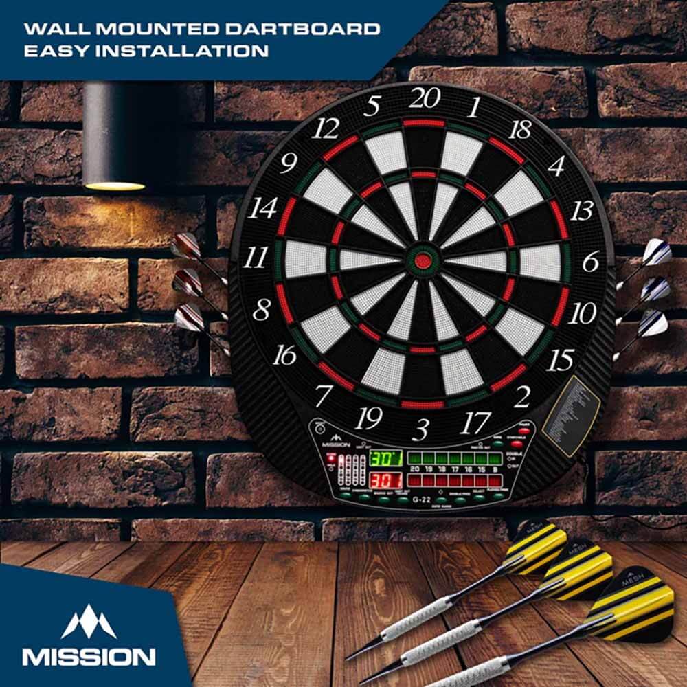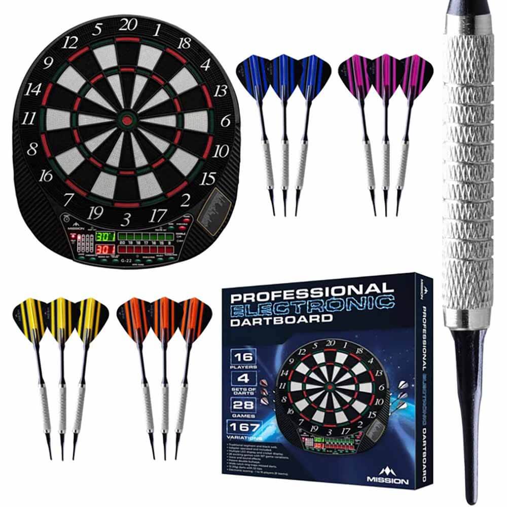 Diana electrónica Mission G220 — Hasta 16 jugadores – 28 juegos – incluye 4 juegos de dardos. Esta diana electrónica de punta blanda es una excelente introducción al mundo de los dardos de punta blanda con segmentos de diana de colores tradicionales, que le brindan todo lo que necesita para comenzar a jugar, incluidos 4 juegos de dardos. Marca: Mission Modelo: G220 Jugadores: 16 Modalidades de juegos : 28 El producto se compone por 1 diana Electronica Mission y 4 juegos de dardos.