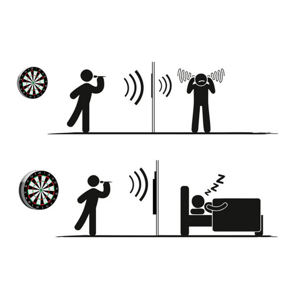 Cuando golpean el tablero, los dardos hacen un ruido de golpeteo , que a veces puede ser percibido como muy molesto en su propio entorno o por sus vecinos. Junto con expertos en insonorización, Karella ahora tiene la solución perfecta para eliminar casi por completo el ruido. Los jugadores de dardos han estado esperando tal invento durante mucho tiempo. El secreto está en la composición y construcción del material: La insonorización Karella de 2 piezas consta de un núcleo de insonorización, en el que se fija la diana de acero, y un anillo de insonorización que lo rodea. Ambas partes están hechas de millones de fibras insonorizantes altamente especializadas. La interacción del núcleo de insonorización y el anillo de insonorización que lo rodea logra un desacoplamiento del ruido casi completo. Cuando el dardo golpea el dardo, el ruido sordo de golpeteo se transmite por la parte posterior de la diana a toda la placa de fibra. En mediciones profesionales, se pudo demostrar una reducción de ruido de más del 80 % en la sala de dardos y las habitaciones adyacentes. Los valores medidos estaban por debajo de 30dB y, por lo tanto, el descanso nocturno reglamentario permanece 100% inalterado. Con su tamaño, el insonorizante Karella de color antracita cubre un área de 12 cm alrededor de la diana y, por lo tanto, también es ideal como envolvente debido a su composición material. Este doble beneficio hace que la compra de la insonorización Karella sea aún más económica. Si es necesario, también se puede utilizar sin restricciones cualquier anillo colector disponible en el mercado. El aislamiento acústico Karella es 100% Made in Germany. El material de fibra está probado para sustancias nocivas según Öko-Tex, sin aditivos químicos. Inodoro y respetuoso con el medio ambiente. El aislamiento acústico es muy estable dimensionalmente y, por lo tanto, muy robusto y duradero, ya que casi no se desgasta. La insonorización ópticamente atractiva es universalmente adecuada para todos los tableros de dardos de acero, incluso las luces de tablero de dardos más comunes aún se pueden usar. Finalmente, todos los fanáticos de los dardos pueden dedicarse a su pasatiempo en cualquier momento del día, gracias a Karella. Volumen de suministro: núcleo de protección contra el ruido, anillo de protección contra el ruido, línea de caída Karella, tacos y tornillos. (La diana no está incluida) dimensión y peso peso neto: 340g diámetro: 450 mm Espesor del material: 30 mm El productos se compone por 1 insonorización para diana convencional, no incluye diana solo la insonorización .
