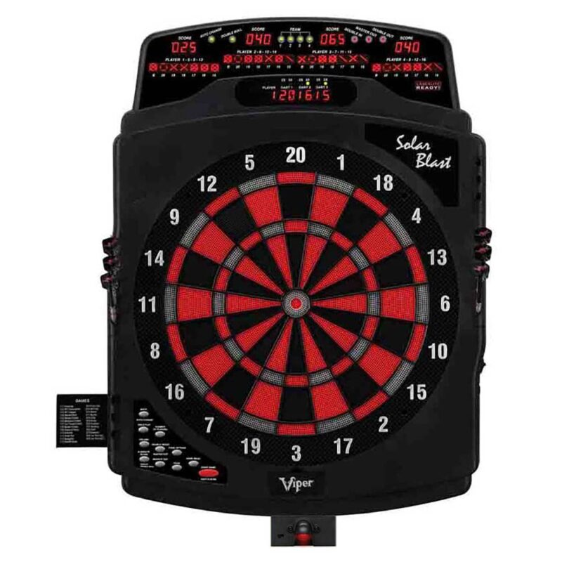 Diana con aro americano triple de 5 puntos, aro de 15.5 tamaño de juego profesional, al rededor del aro tiene aro recoge dardos fuera, La diana Solar Blast tiene 57 juegos y 307 opciones , incluye opciones populares como doble in/out single in/out y double bulls. Aro receptor muy elegante gracias a sus colores rojo, negro sobre gris que hacen de esta diana que siempre podrás ver los dardos sin pegas donde han puntuado. Segmentos muy resistentes aptos para uso intensivo y entrenamiento, sus agujeros son cóncavos para evitar los molestos rebotes de los dardos, su LCD incluye grandes pantalla para el cricket gracias a ser retro iluminada su visión es perfecta desde cualquier angulo, incluye media por dardos y por ronda en los juegos 01 y cricket, incluye función de juego handicap. Gracias a su botonera muy completa de 11 botones tendrás todas las funciones necesarias para que tu diana Solar Blast se lo mas completo y fácil de manejar,dispone en los laterales soportes para 6 dardos 2 juegos y un cajon en la parte posterior media de la diana para poner puntas. Dispone de modo de juego contra la diana con 3 niveles de dificultad. Da la opción de jugar hasta 16 jugadores en modo multijugador incluso en el juego en equipo. Incluye 6 dardos completos y transformador de 220V. Incluye linea de tiro led