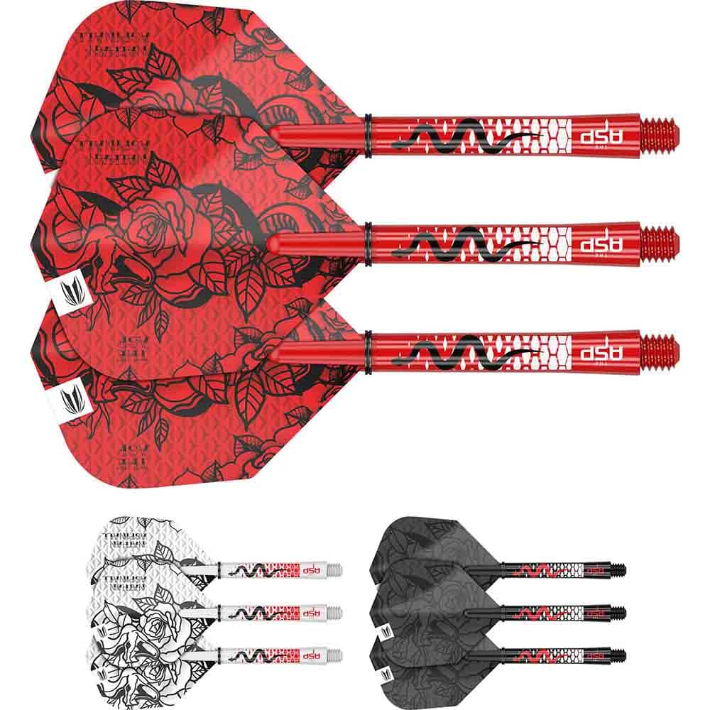 Juego de cañas + plumas para dardos fabricadas por Target Darts y diseñadas por el jugador Target Nathan Aspinall En el paquete se incluyen 3 juegos de varillas Pro Grip en 3 combinaciones de colores con su propio diseño y 3 juegos de plumas No.6 con 3 combinaciones de colores con diseño de impresión UV puntual y material de 100 micras para mayor durabilidad. Marca: Target Modelo: Nathan Aspinall Geometría: No6 Shape Medida Caña: Intermedia 41mm Grosor Pluma: 100 Micrones Contenido: 9 plumas + 9 cañas El producto se compone por 3 sets de 3 plumas + 3 set de 3 cañas , total 9 plumas + 9 cañas Target Nathan Aspinall