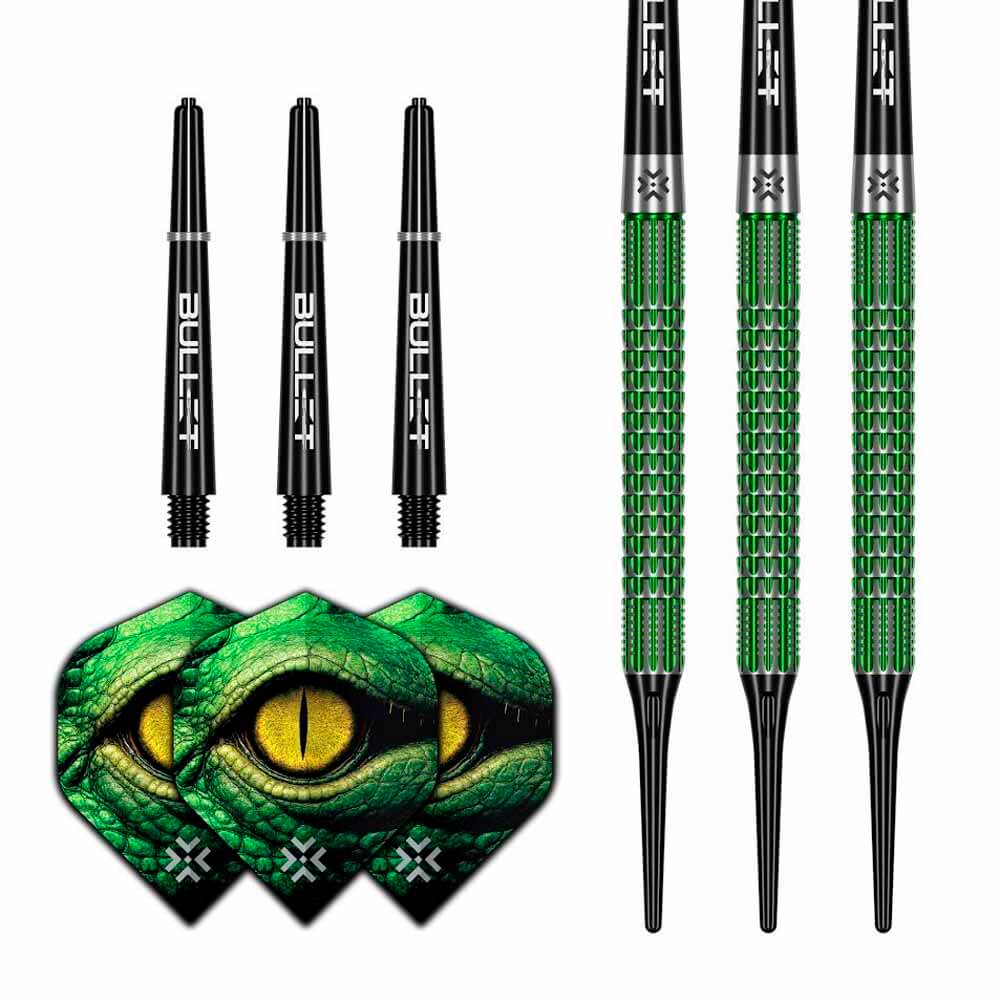 Bullit Gator 90% Soft Tip Dardos: calidad y gran precisión lo tiene todo en un solo modelo de dardos Los dardos Bullit Gator 90% Soft Tip tiene un barril fabricado con nada menos que un 90% de tungsteno para que puedas disfrutas de durabilidad y una gracias a su barril muy fino se adapta perfectamente a tu mano aportando una gran precisión. La forma recta del barril asegura un lanzamiento estable y preciso Lo que realmente hace especiales a estos dardos es el agarre mecanizado (milled grip) distribuido a lo largo de todo el cuerpo del dardos. Nivel de agarre 4 sobre 5 ofrecen un equilibrio perfecto entre sujeción y suavidad. Además de sus cualidades técnicas, los dardos Bullit Gator tienen un aspecto elegante . Combina a la perfeccion los colores negro, verde y plata para dar un estilo moderno y robusto. Dardos con un equilibrio centrado el peso está justo en el centro del barril, lo que asegura un juego estable y evitara desviaciones. Con una longitud de 52 milímetros y un diámetro de 6,3 milímetros. Marca: Bullet Modelo: Gator Peso: 20 gr Material: 90% tungsteno Largo: 52 mm Diametro: 6.3 mm El producto se compone por 1 set de 3 cuerpos Gatos, set de 3 cañas y set de 3 plumas