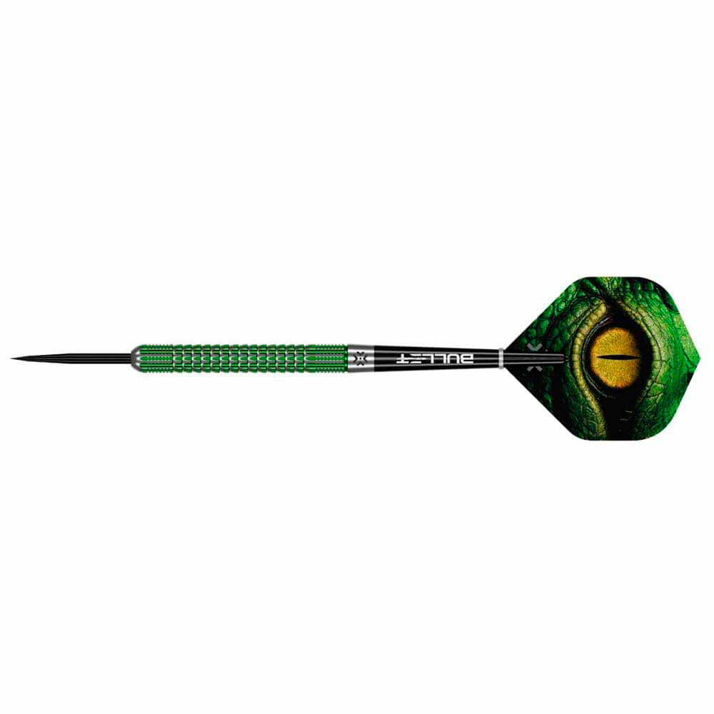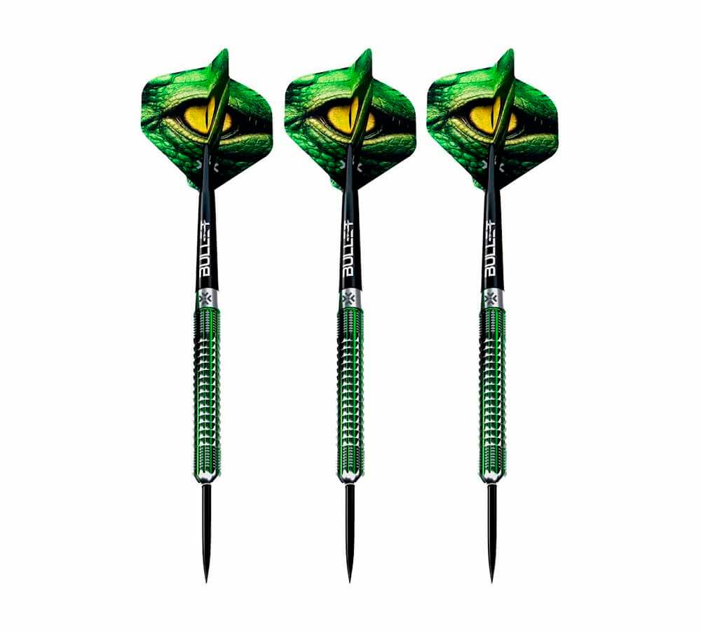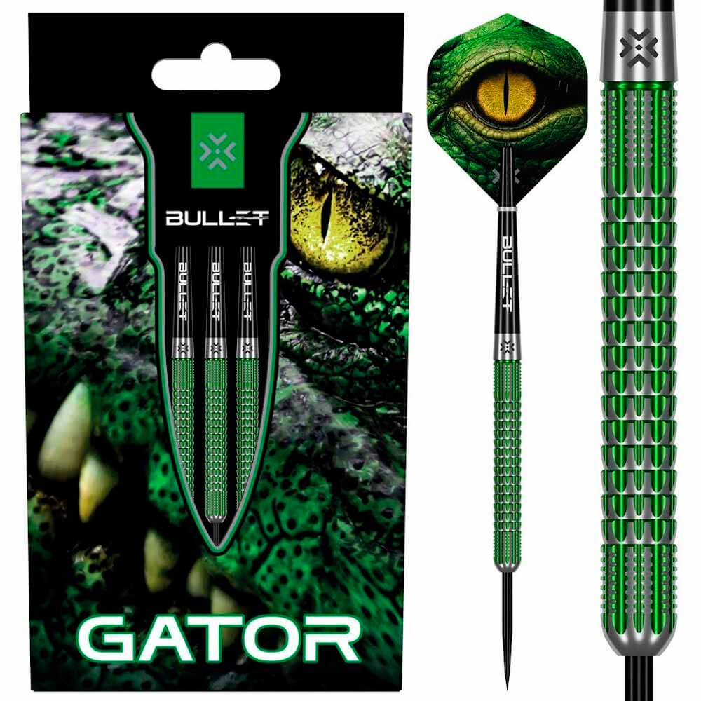 Bullit Gator 90% Soft Tip Dardos: calidad y gran precisión lo tiene todo en un solo modelo de dardos Los dardos Bullit Gator 90% Steel tip tiene un barril fabricado con nada menos que un 90% de tungsteno para que puedas disfrutas de durabilidad y una gracias a su barril muy fino se adapta perfectamente a tu mano aportando una gran precisión. La forma recta del barril asegura un lanzamiento estable y preciso Lo que realmente hace especiales a estos dardos es el agarre mecanizado (milled grip) distribuido a lo largo de todo el cuerpo del dardos. Nivel de agarre 4 sobre 5 ofrecen un equilibrio perfecto entre sujeción y suavidad. Además de sus cualidades técnicas, los dardos Bullit Gator tienen un aspecto elegante . Combina a la perfecion los colores negro, verde y plata para dar un estilo moderno y robusto. Dardos con un equilibrio centrado el peso está justo en el centro del barril, lo que asegura un juego estable y evitara desviaciones. Con una longitud de 52 milímetros y un diámetro de 6,3 milímetros. Marca: Bullet Modelo: Gator Peso: 21 gr Material: 90% tungsteno Largo: 52 mm Diametro: 6.3 mm Punta: Metal El producto se compone por 1 set de 3 cuerpos Gatos, set de 3 cañas y set de 3 plumas